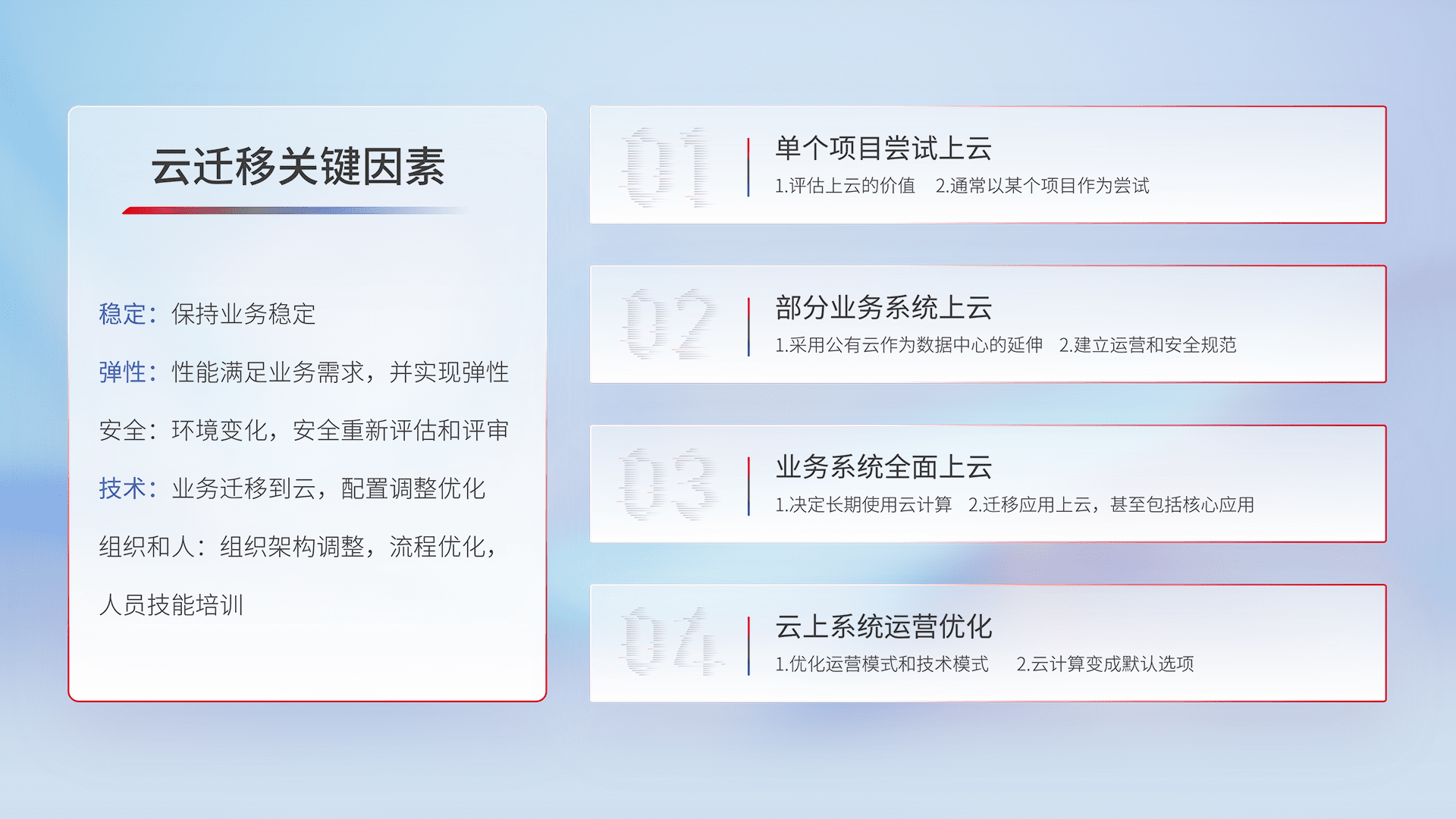 结合实际业务,,,从规划设计、、、云平台选型、、云原生改造、、数据迁移、、、集成交付,,,迁移全过程为客户识别最佳上云路径,,,做好风险识别管理,,设计网络架构、、、身份权限、、、安全审计合规、、、操作审计、、、、日志审计、、监控告警策略、、、多站点容灾设计等,,对云上基础设施进行整体规划,,提升IT治理水平,,以满足弹性、、、、高可用、、高性能的需求。。