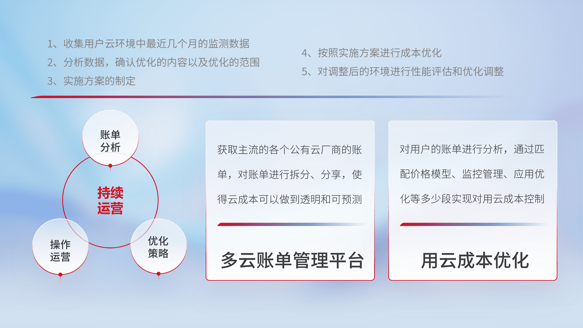 通过多云纳管,,,,以统一的资源数据模型把客户的云资源进行抽象和封装,,,,进而实现对多云资源的统一操作,,,,保障云资源管理的可靠性、、稳定性与可用性。。。。量身定制化运维内容,,,配置、、开发运维、、、、补丁管理、、、备份、、、监控、、、认证和访问管理、、、审计和日常巡检等,,,,保障在用云过程中的可靠度,,,稳定度以及高可用率。。。