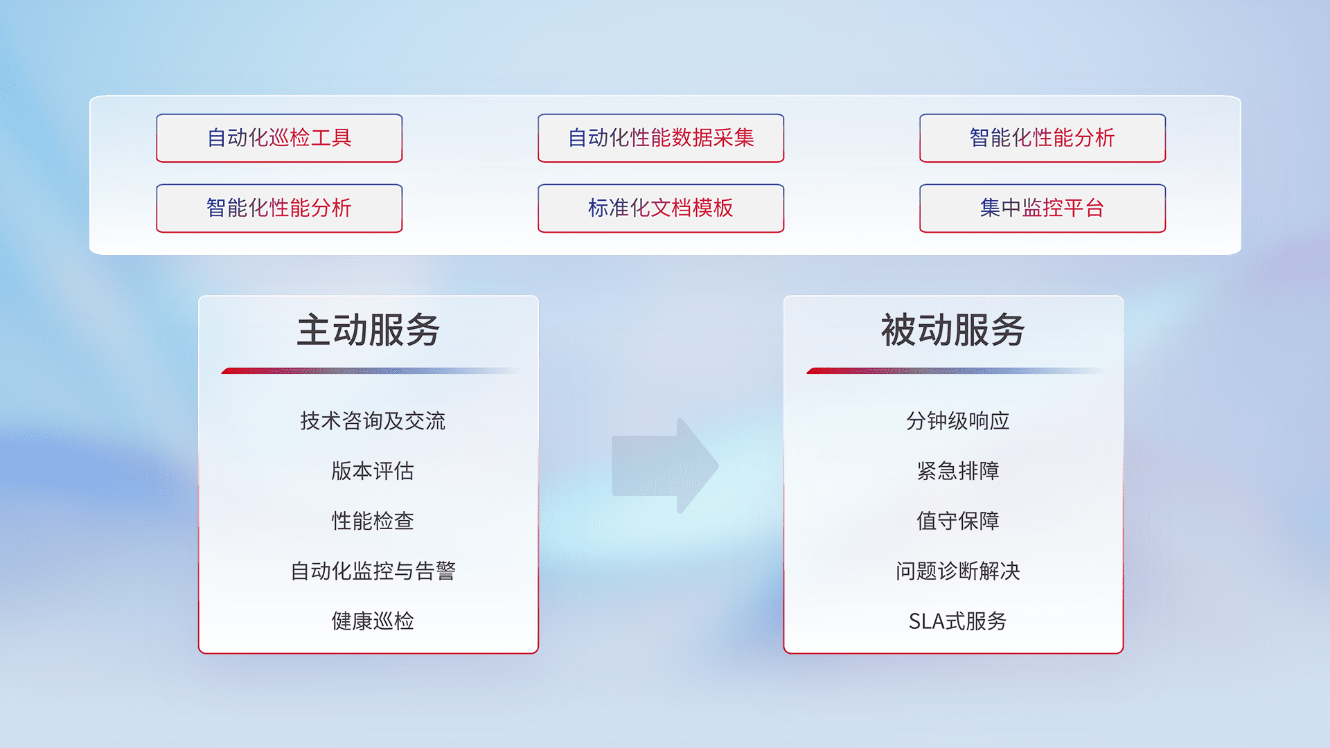 智能化工具和标准化文档,,保障服务质量,,,,提供主动服务(包含技术咨询、、、、版本评估、、、、性能检查、、、、自动化监控与告警、、健康巡检)和被动服务包含(分钟级响应、、紧急排障、、、、值守保障、、、问题诊断解决、、、、SLA服务)。。。。